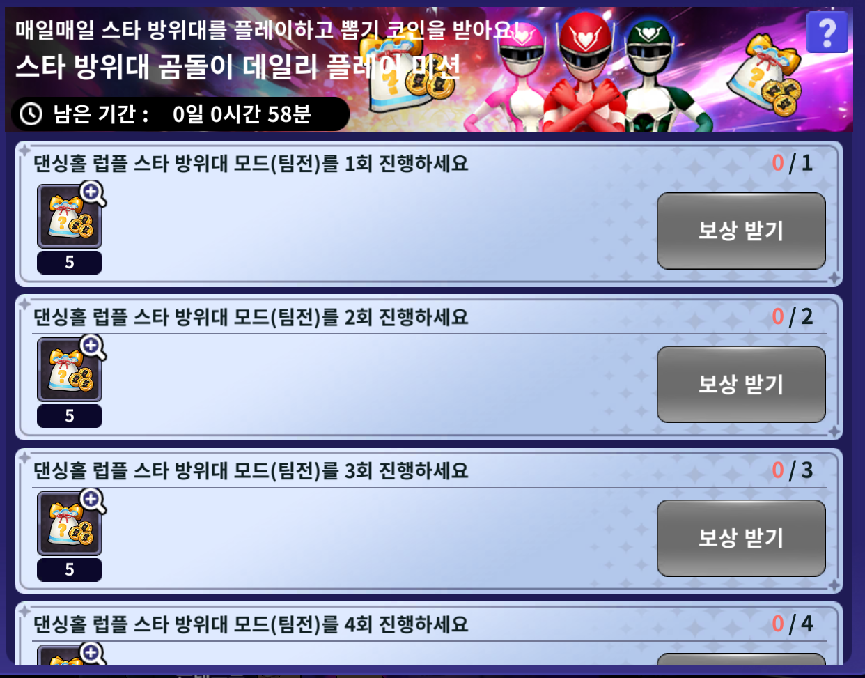 | 럽플 스타 방위대 플레이 5회 | 곰돌이 캡슐 뽑기 코인 꾸러미 5개 | 럽플 혼자서도 잘해요 플레이 5회 | 곰돌이 캡슐 뽑기 코인 꾸러미 5개 |