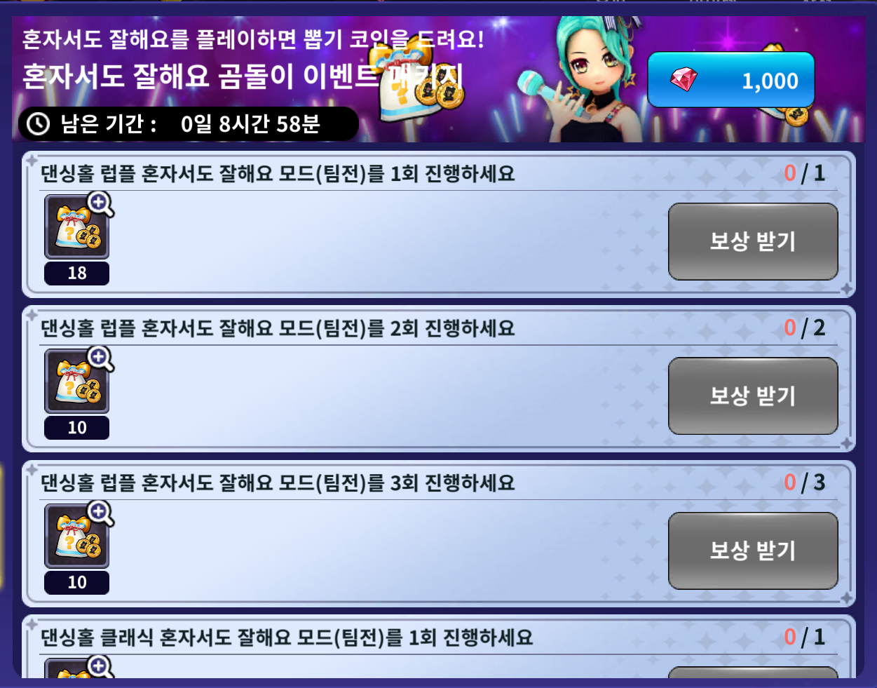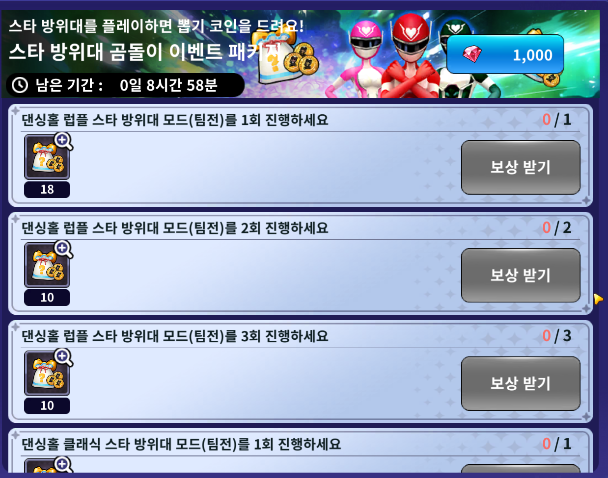 | 클래식 스타 방위대 플레이 5회 | 곰돌이 캡슐 뽑기 코인 꾸러미 5개 | 클래식 혼자서도 잘해요 플레이 5회 | 곰돌이 캡슐 뽑기 코인 꾸러미 5개 |