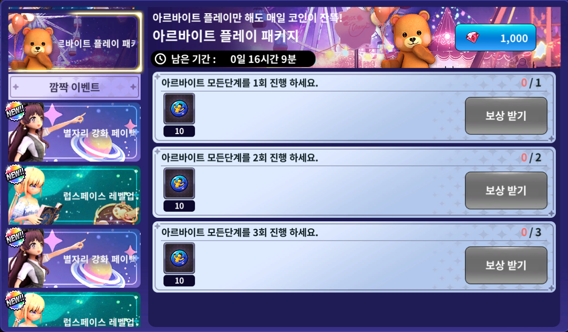 | 아르바이트 플레이 3회 | 풍선 인형 코인 10개 |