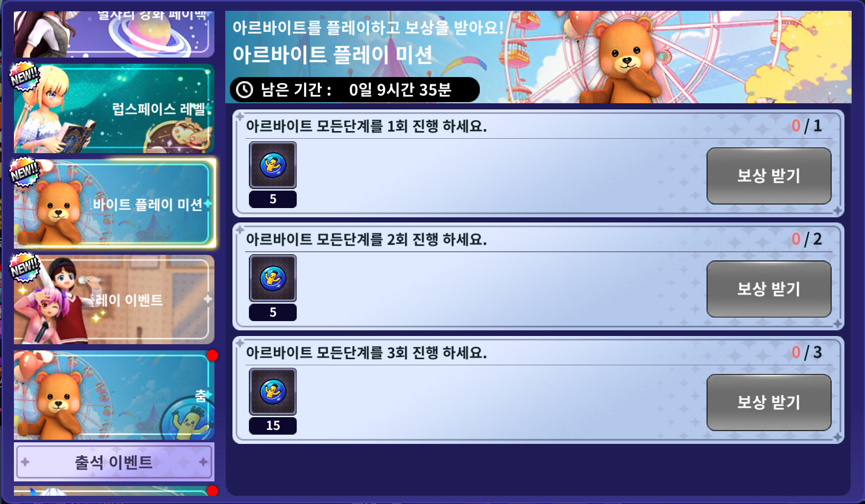 | 아르바이트 플레이 3회 | 풍선 인형 코인 15개 |