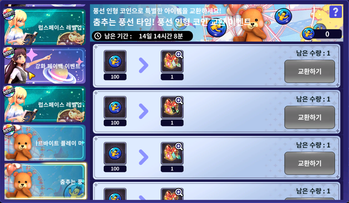 - [메인화면] - [메뉴] - [이벤트] - [깜짝 이벤트] - [춤추는 풍선 타임! 풍선 인형 코인 교환 이벤트]를 통해 진행할 수 있습니다.