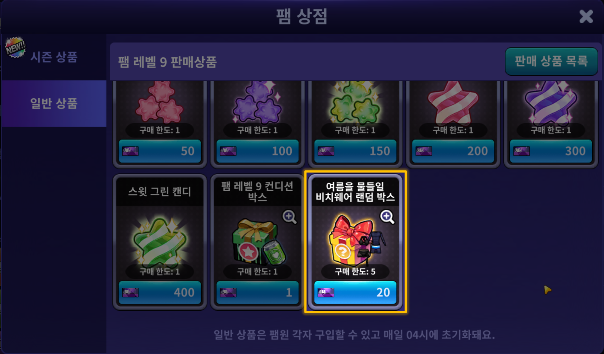 | 여름을 물들일 비치웨어 랜덤 박스 | 팸 상점 티켓 20개 ※ 일일구매 제한: 5회 | ![]() |