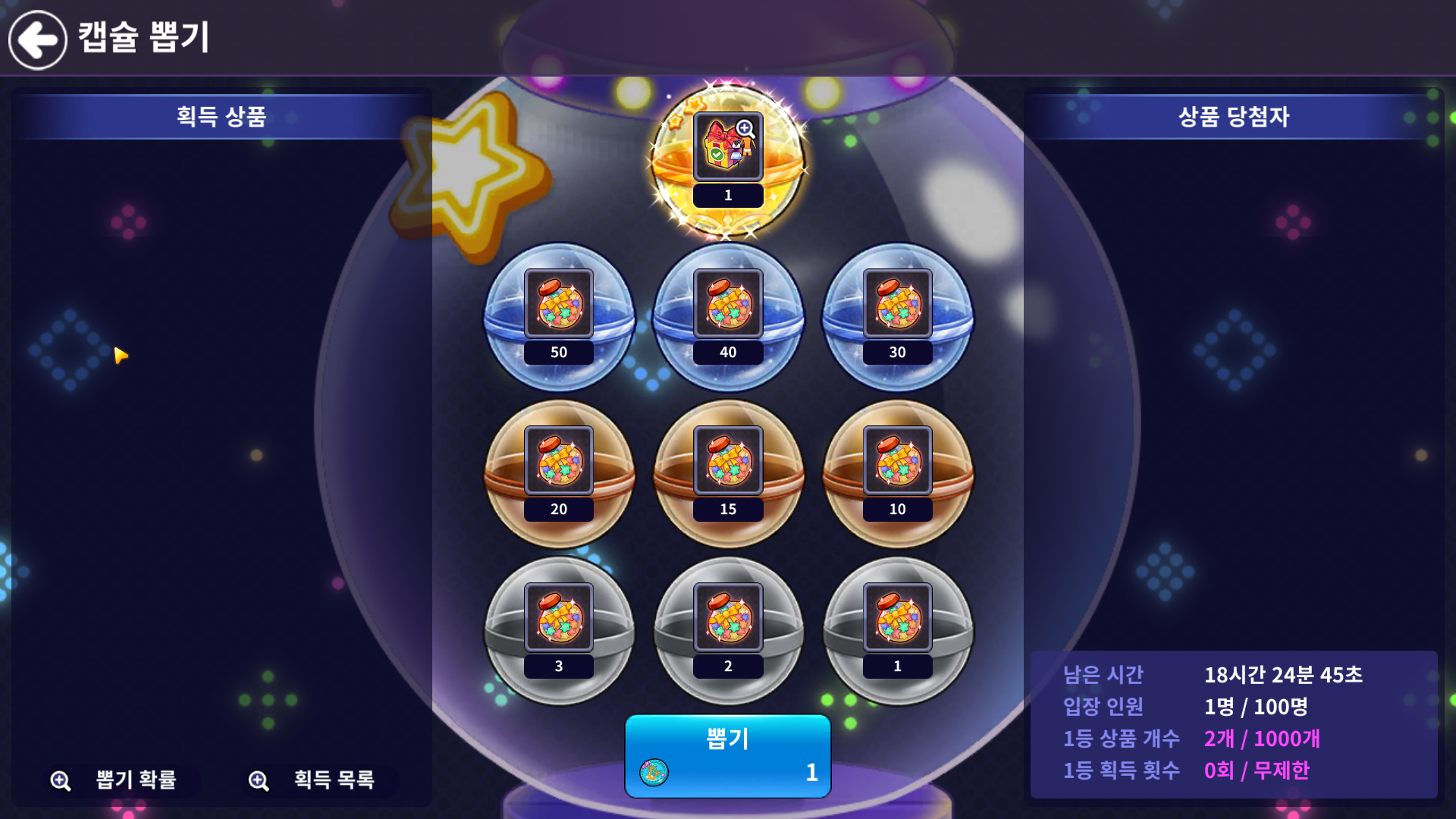 - 1등 상품에 한정된 개수가 모두 소진되거나, 진행 시간이 마감될 경우 해당 캡슐 뽑기가 종료됩니다.