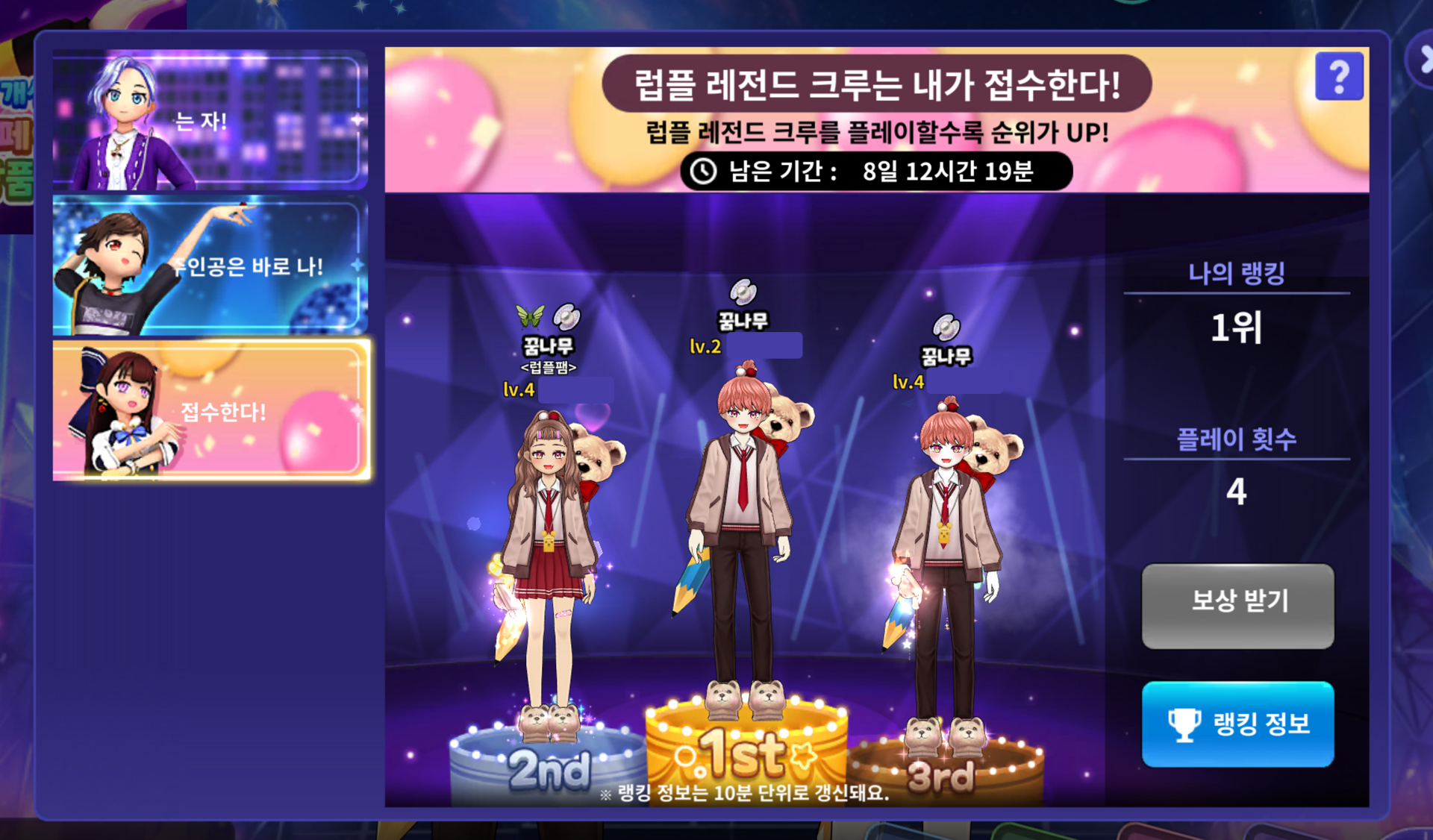 [메인화면] - [메뉴] - [랭킹] - [럽플 레전드 크루는 내가 접수한다!] 화면에서 랭킹 정보를 확인 가능합니다.