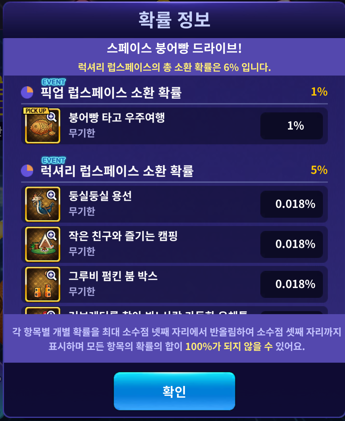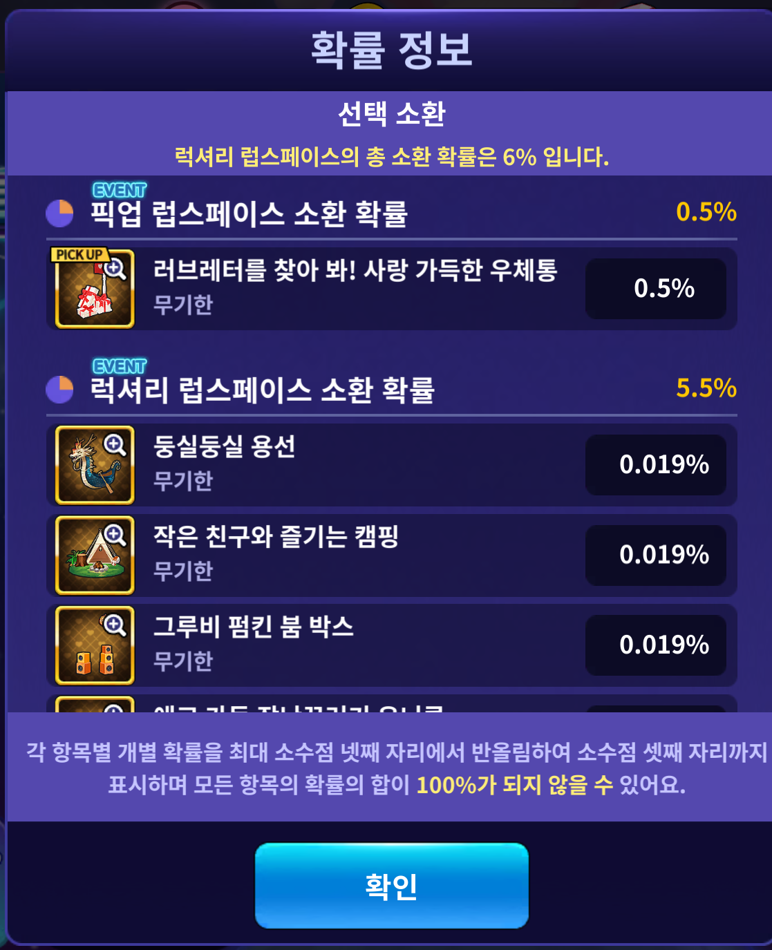 ※ 상세한 럽스페이스 소환 확률 내용은 게임 내에서 확인하실 수 있습니다.