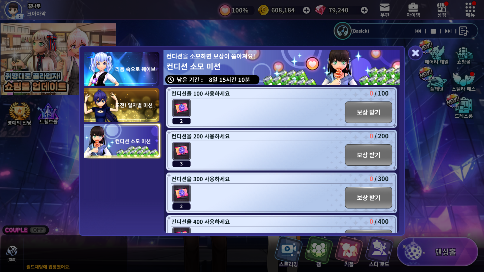 | 100 컨디션 소모하기 | 컨디션 룰렛 티켓 2장 |