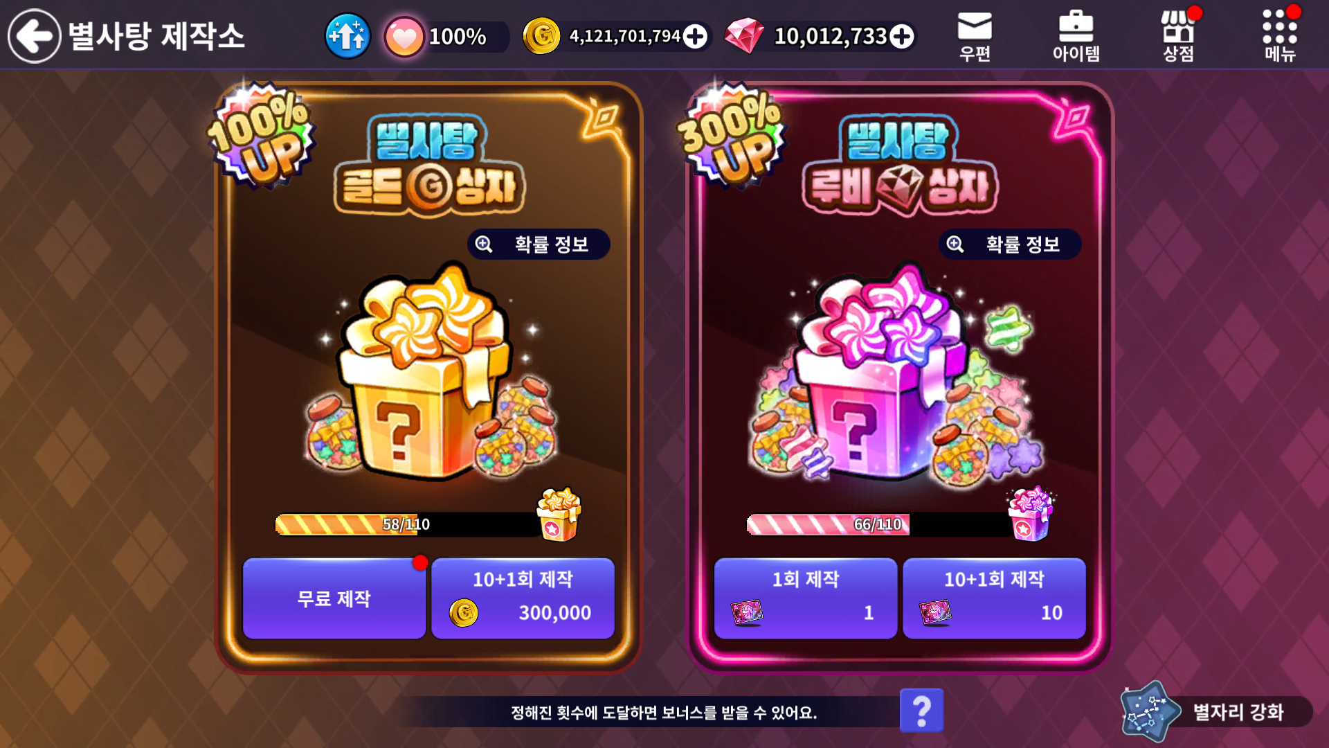 - 이벤트 기간 동안 별사탕 제작소에서 제작 진행 시, 기존 대비 별사탕 골드 상자 제작량이 2배, 별사탕 루비 상자 제작량이 4배 증가합니다.