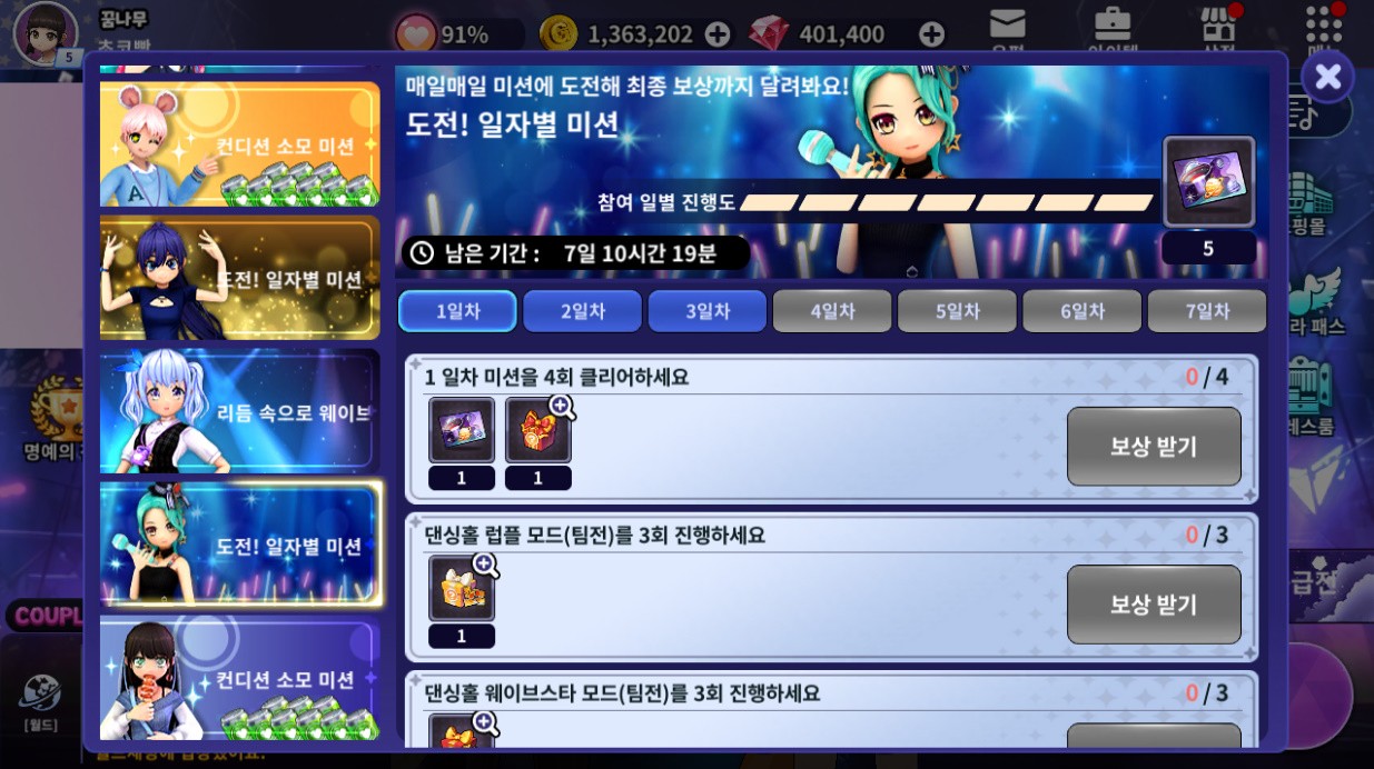 [메인화면] - [메뉴] - [이벤트] - [도전 이벤트] - [도전! 일자 별 미션] 화면에서 매일 미션을 달성하여 보상을 획득할 수 있습니다.