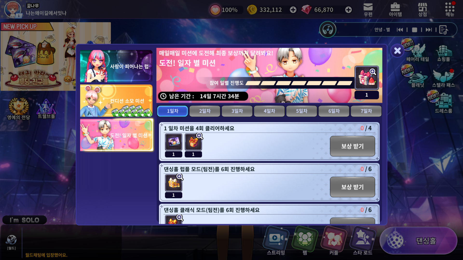 출석 시간을 기준으로 게임에 접속하지 않을 경우 일차 별 미션이 오픈되지 않습니다.