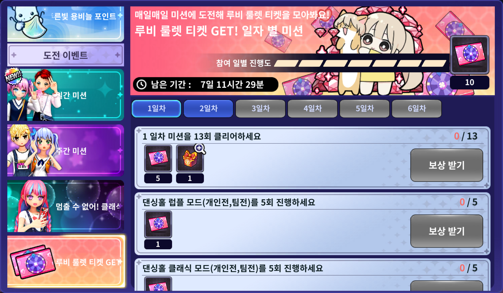 [메인화면] - [메뉴] - [이벤트] - [도전 이벤트] - [루비 룰렛 티켓 GET! 일자별 미션] 화면에서 일자별 미션을 달성하여 보상을 획득할 수 있습니다.