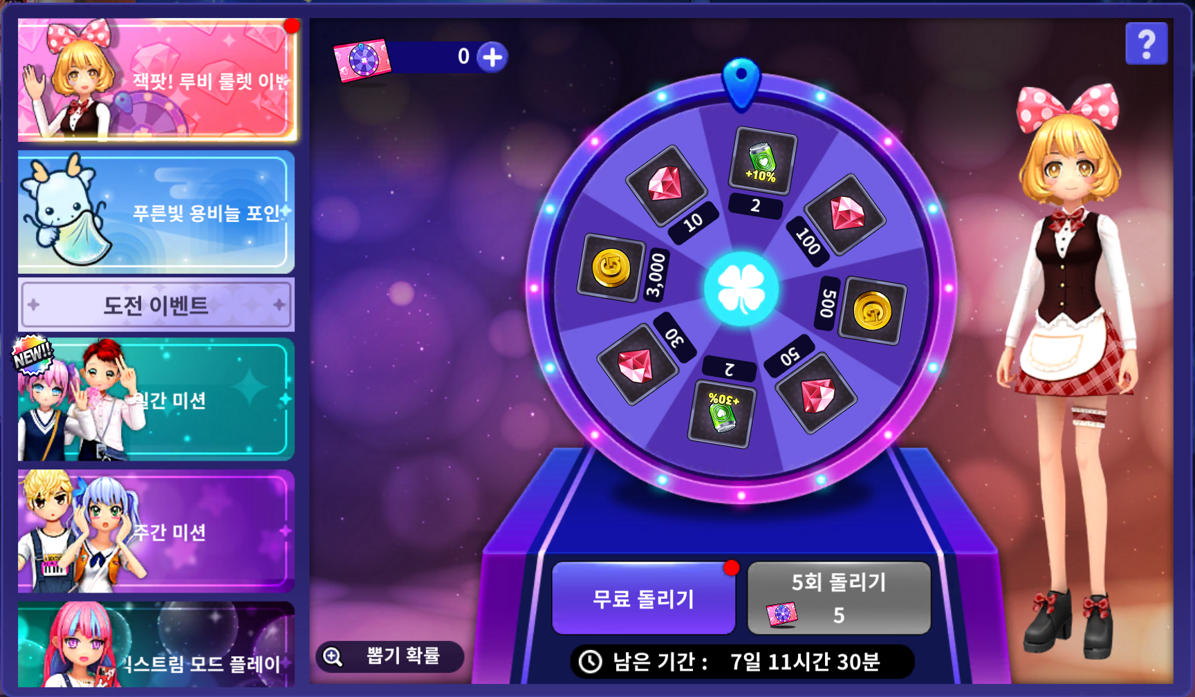 [메인화면] - [메뉴] - [깜짝 이벤트] - [잭팟! 루비 룰렛 이벤트]를 클릭하면 룰렛을 이용할 수 있습니다.