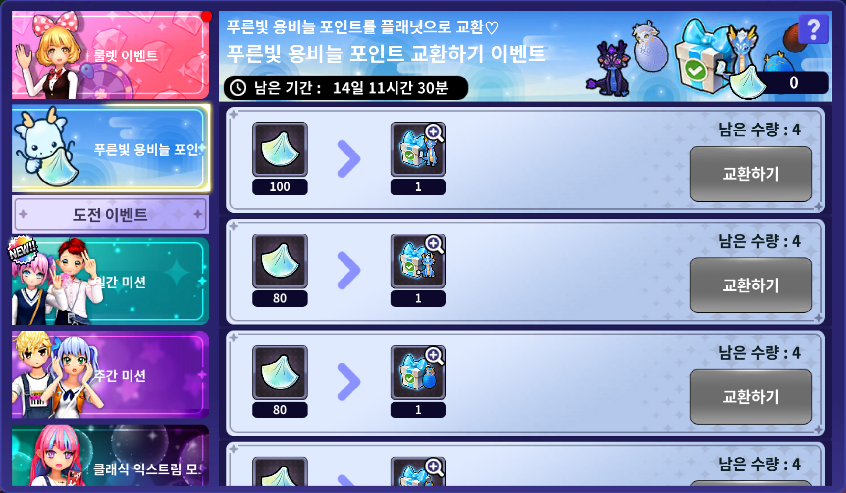 획득한 [푸른빛 용비늘 포인트]를 "용 플래닛 이벤트 박스"로 교환할 수 있습니다.