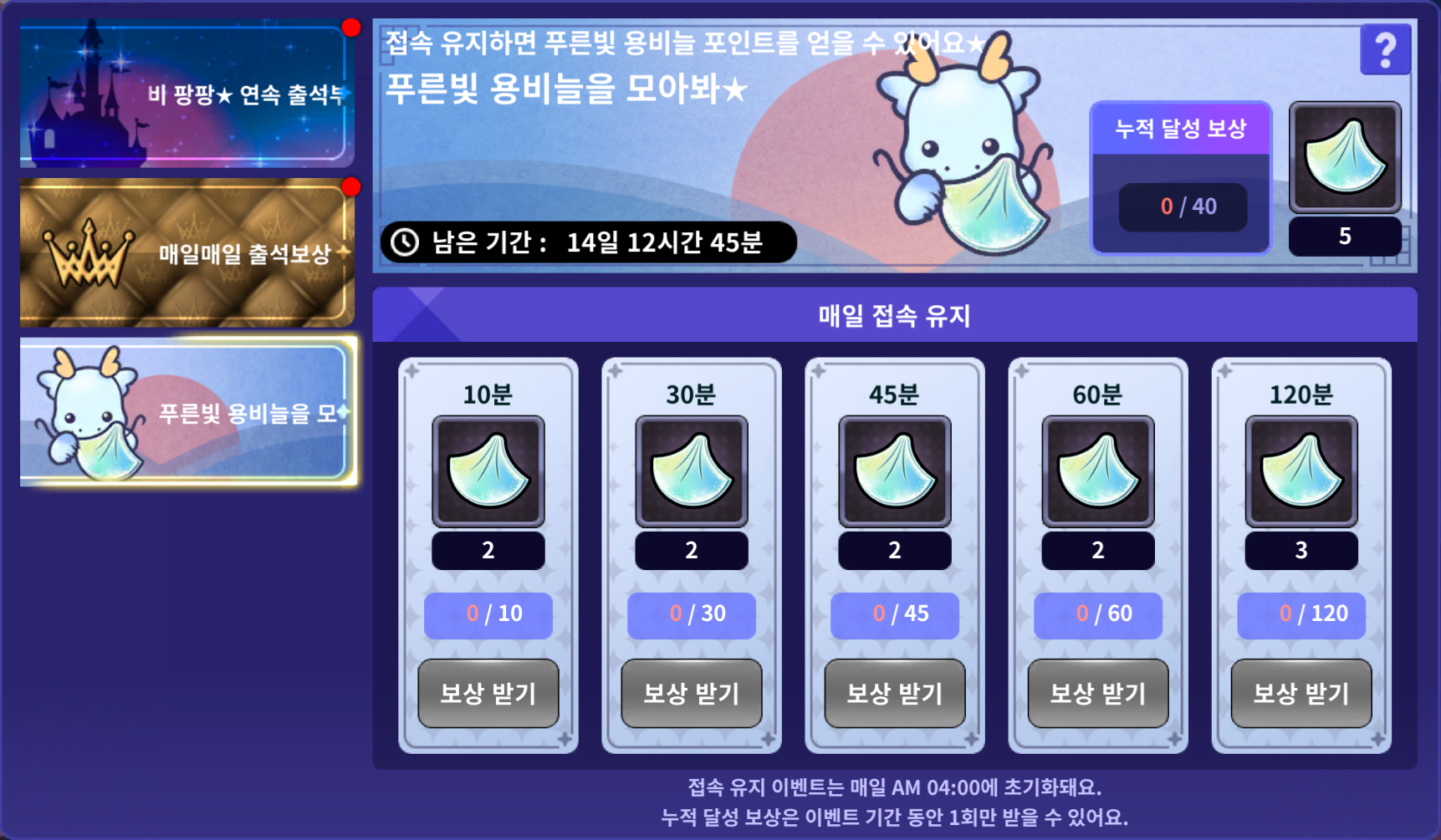 [메인화면] - [메뉴] - [출석부]를 클릭 후 [푸른빛 용비늘을 모아봐★ 접속 유지 이벤트]를 통해 확인할 수 있습니다.