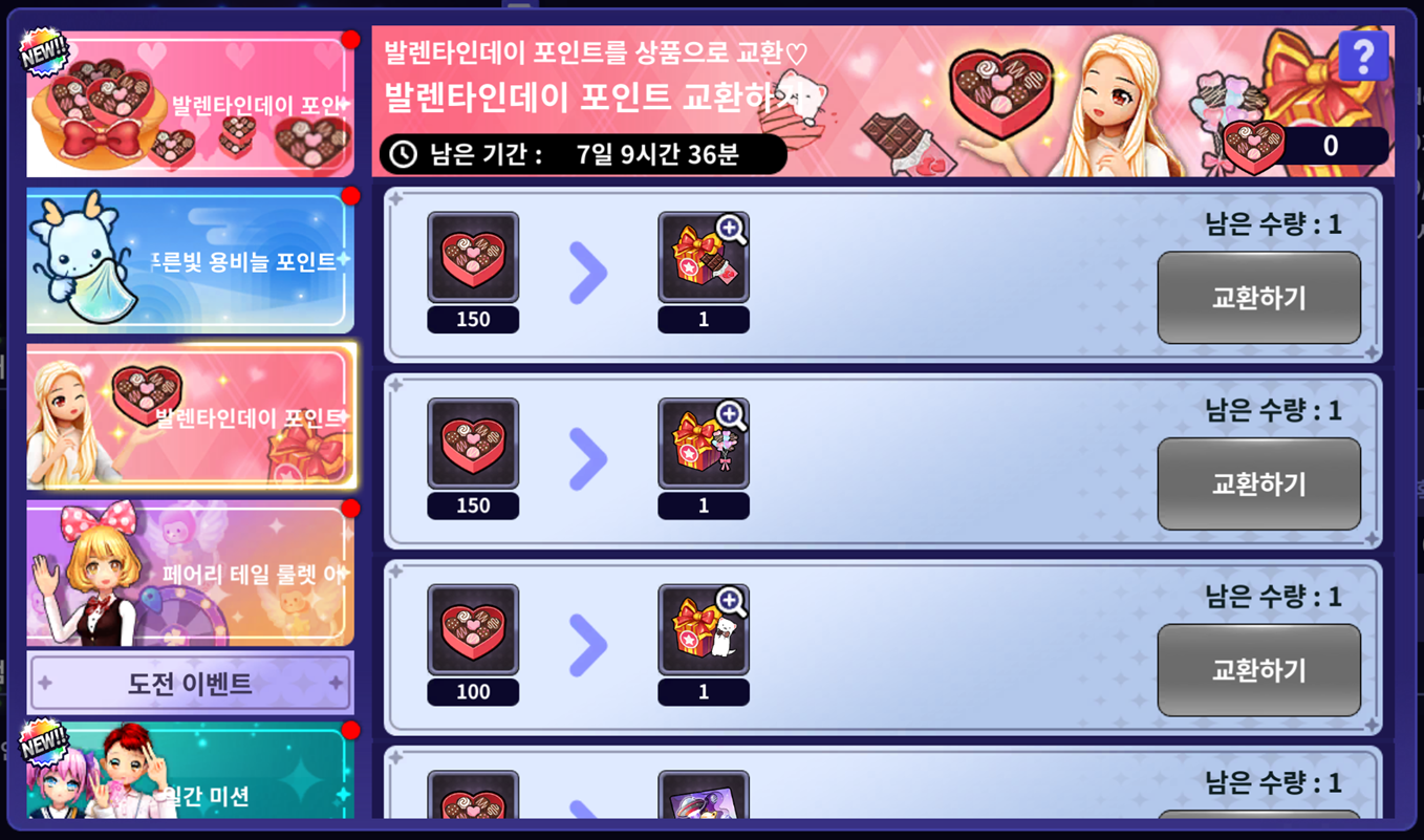 매일 미션을 달성하여 [발렌타인데이 포인트]를 획득할 수 있습니다.