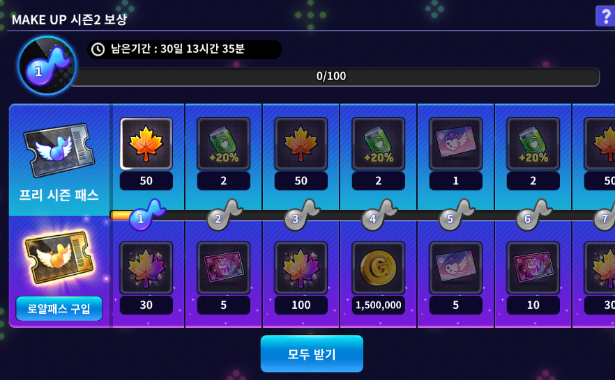 | 시즌 포인트 100 FAME 포인트 400 | 여우야 여우야 뭐 하니? 꾸러미 10개 10,000,000 골드 FAME 포인트 1,000 |