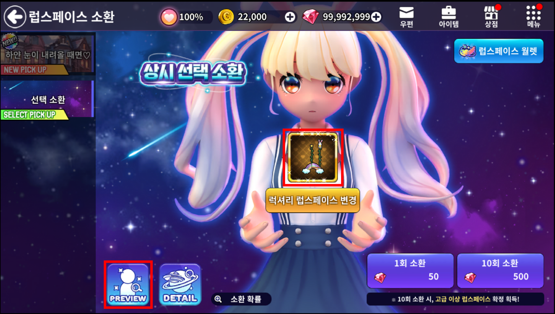 현재 럽스페이스 상시선택소환에서, '놀러와! 별나라의 그네' 플래닛 선택 후 PREVIEW 진행 시
