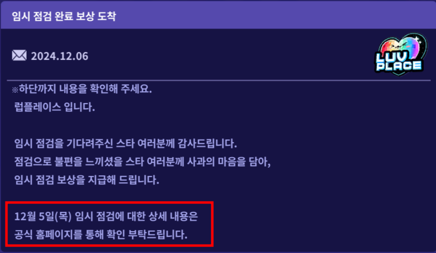 12월 6일(금) 18시 30분 임시점검 안내 메세지 오류 안내 LUVPLACE