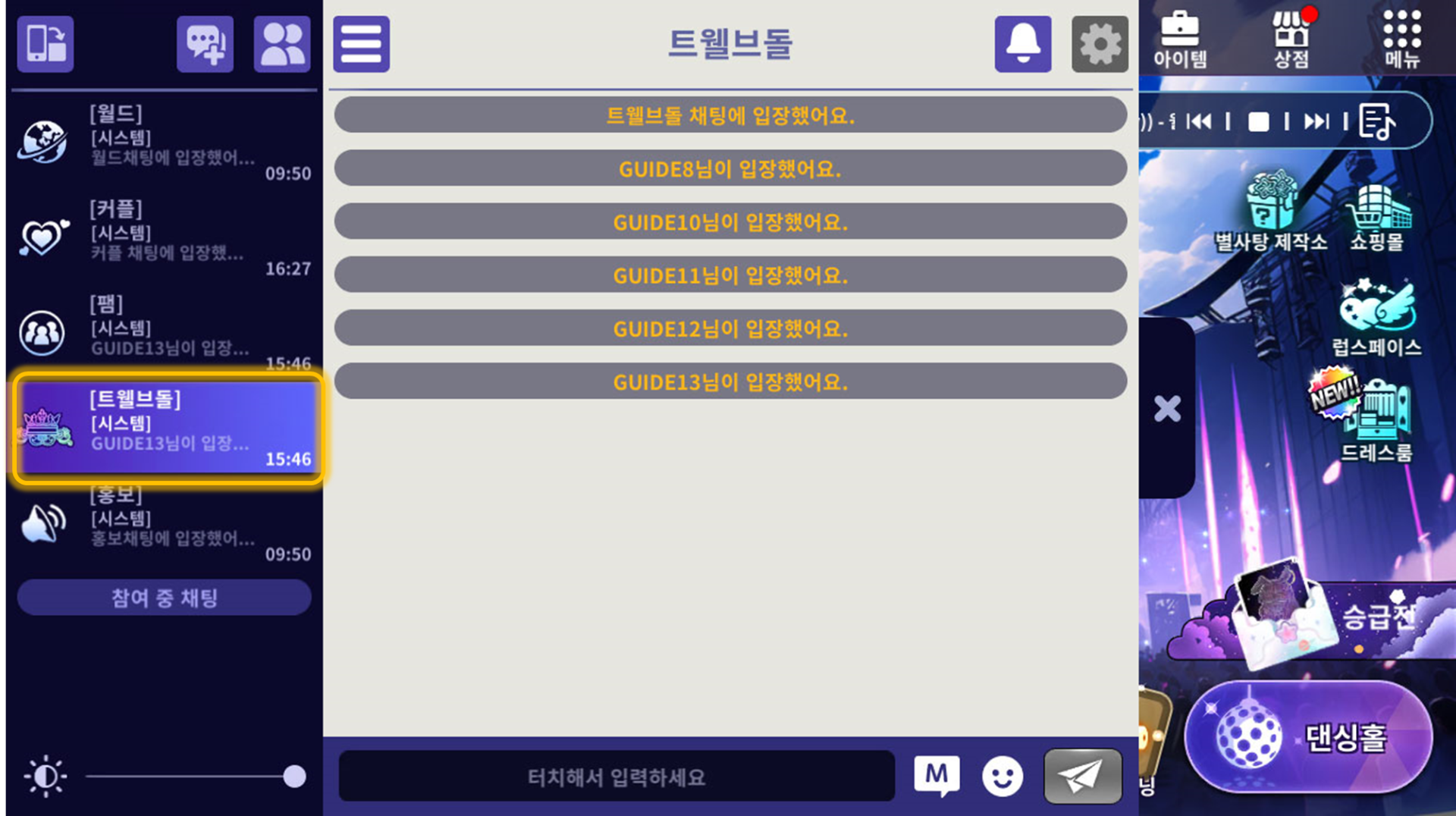 트웰브돌 전용 채팅방이 개설되어 트웰브돌 활동 기간 동안 이용할 수 있습니다.