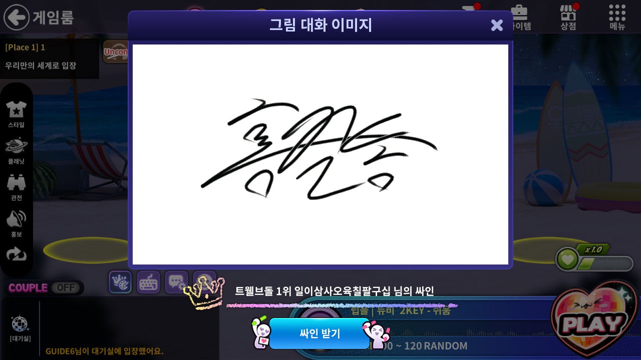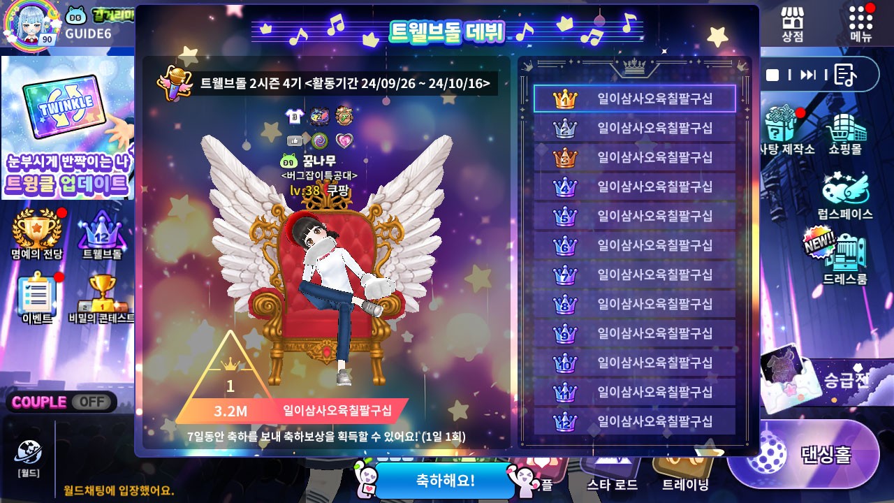 [댄싱홀] - [게임룸] 에서 트웰브돌 스타 님의 싸인을 눌러 보상을 받을 수 있습니다.