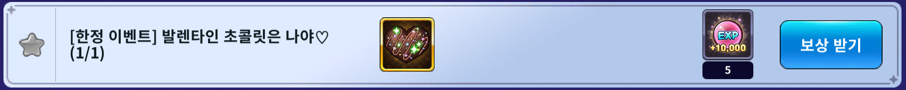 - 발렌타인 초콜릿은 나야♡ (보상: 10,000 EXP 5개)