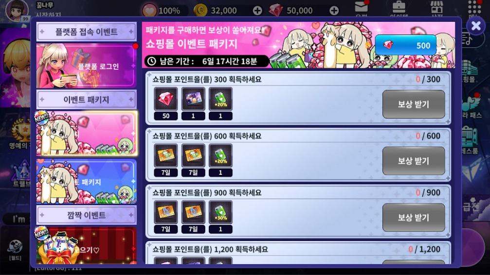 - 쇼핑몰 이벤트 패키지 구매 후 기간 내 달성하지 못하거나, 수령하지 못한 보상은 복구 되지 않으니 초기화 전 보상 받기를 진행해 주세요.