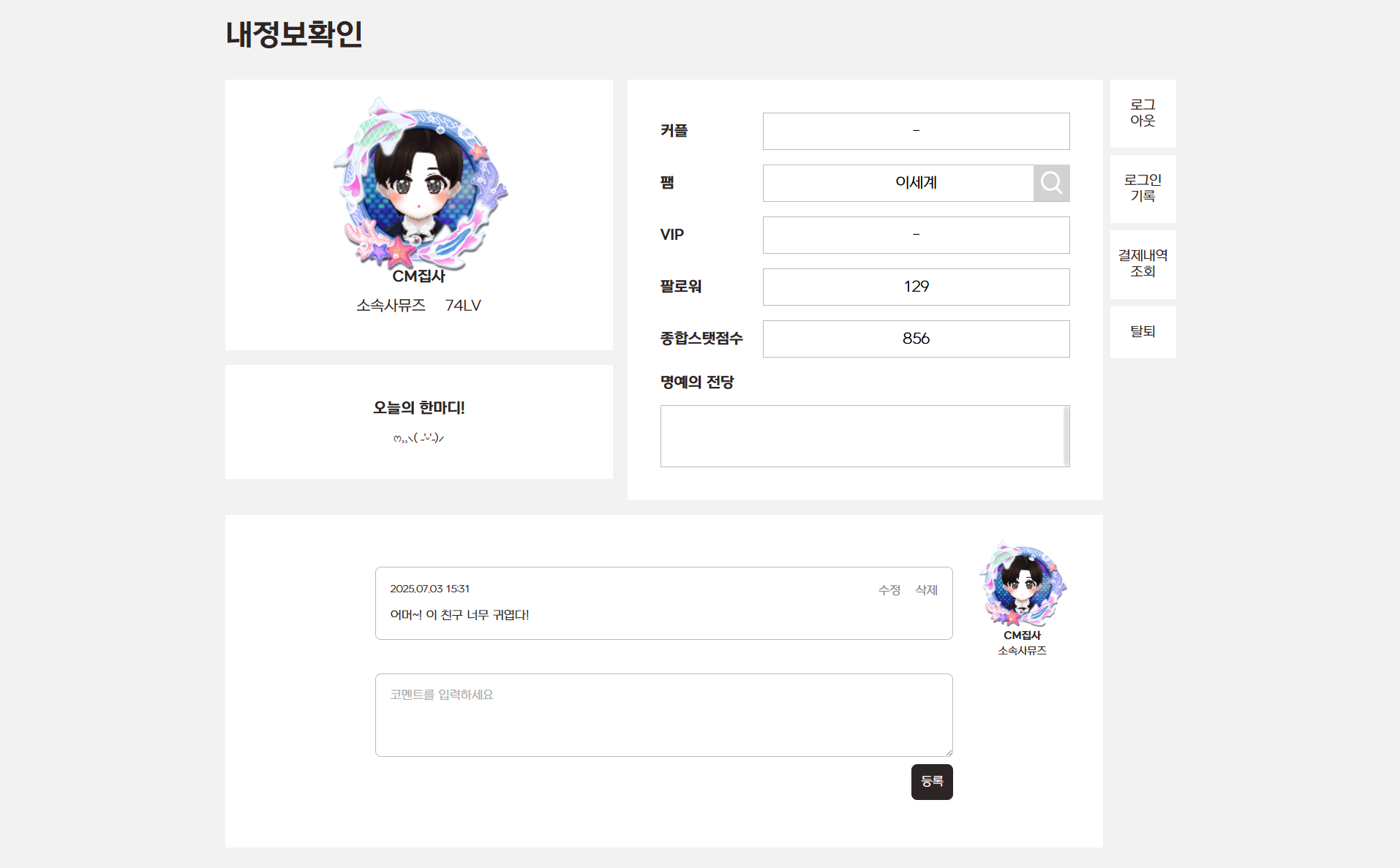 - 프로필 사진을 선택하면 보다 상세한 캐릭터 정보를 확인하실 수 있으며, 다른 스타 님께서 내 캐릭터 정보에 대한 코멘트를 남기실 수 있습니다.