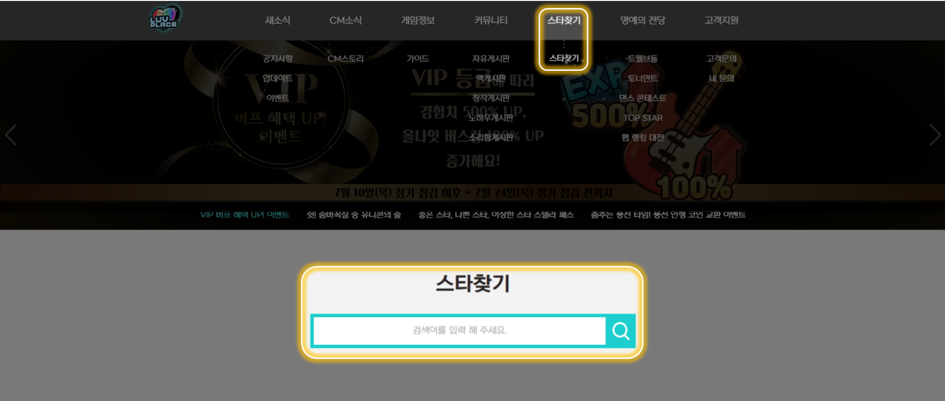 - '스타찾기' 기능은 럽플레이스 홈페이지 메뉴 [스타찾기] - [스타찾기]를 통해 이용하실 수 있습니다.