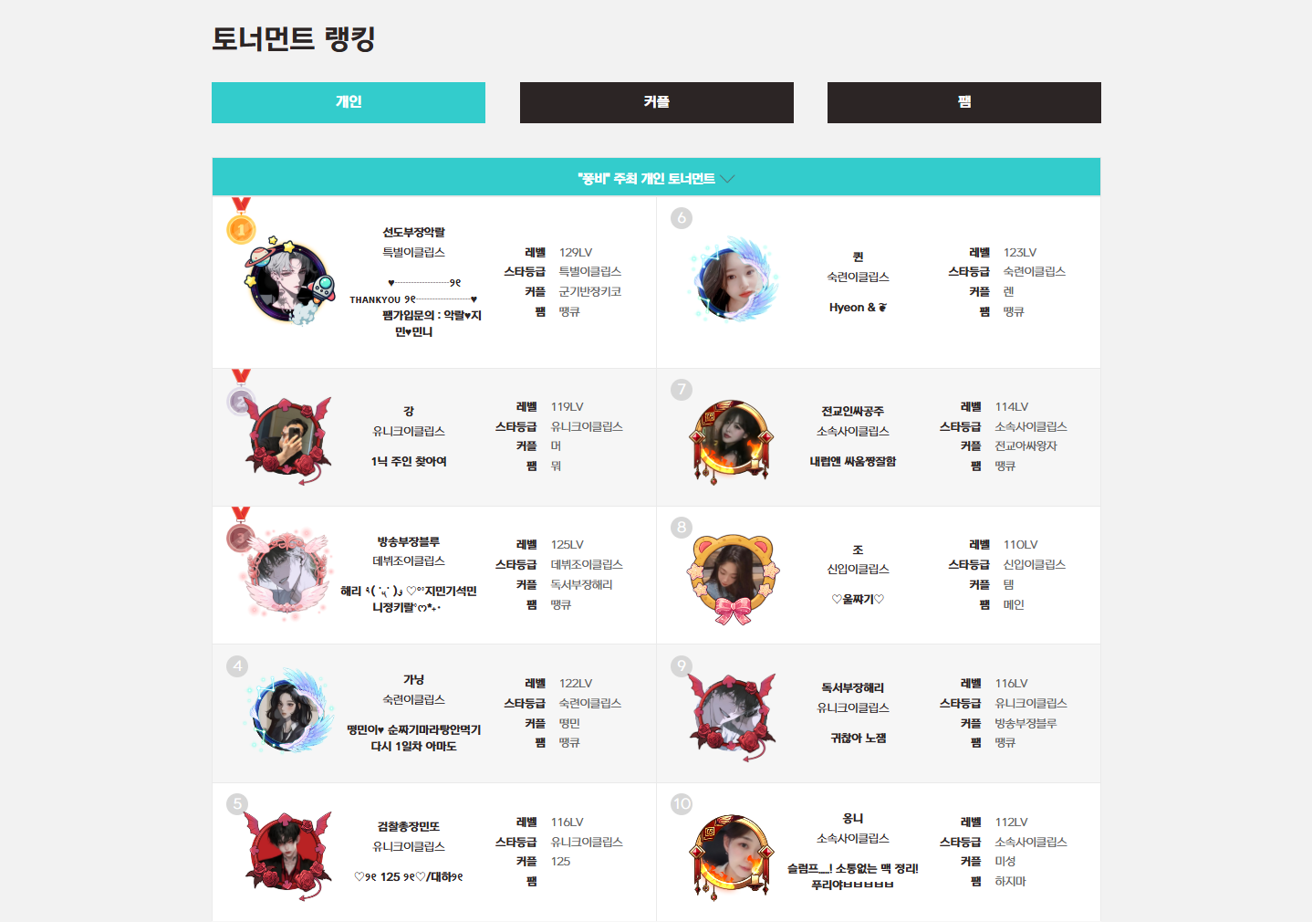 - 현재 순위를 확인할 수 있는 콘텐츠는 트웰브돌 / 토너먼트 / 댄스 콘테스트 / TOP STAR / 팸 랭킹 대전 입니다.