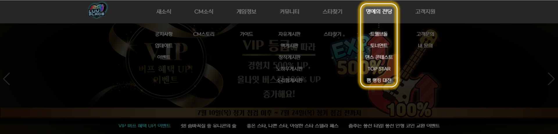 - '명예의 전당' 기능은 럽플레이스 홈페이지 메뉴 [명예의 전당] - [콘텐츠명]을 통해 열람하실 수 있습니다.
