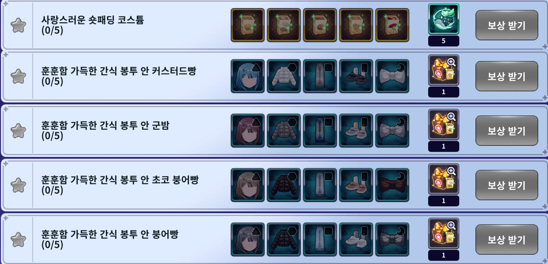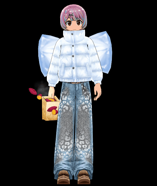 | 훈훈함 가득한 간식 봉투 안 군밤 | 큐티 X핀 포인트 벼머리 헤어 큐티 숏패딩 그레이 큐티 패턴 와이드 진 큐티 복슬 블로퍼 큐티 아이코닉 빅 리본 | 사랑스러운 큐티 숏패딩 수집 보상 박스 (보상 : 훈훈함 가득한 간식 봉투 안 군밤) |