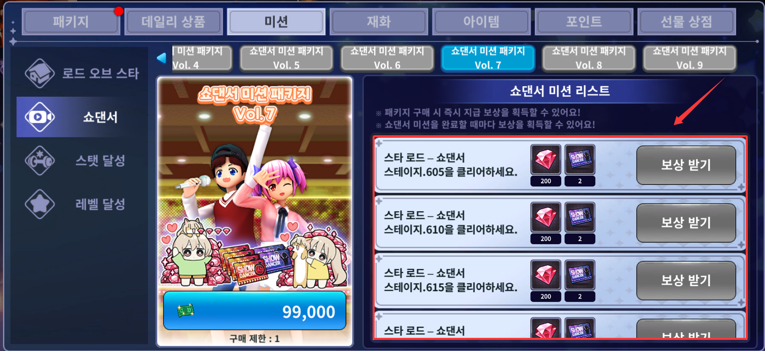 쇼댄서 미션 패키지 Vol. 7 : 쇼댄서 스테이지 605 ~ 700 클리어