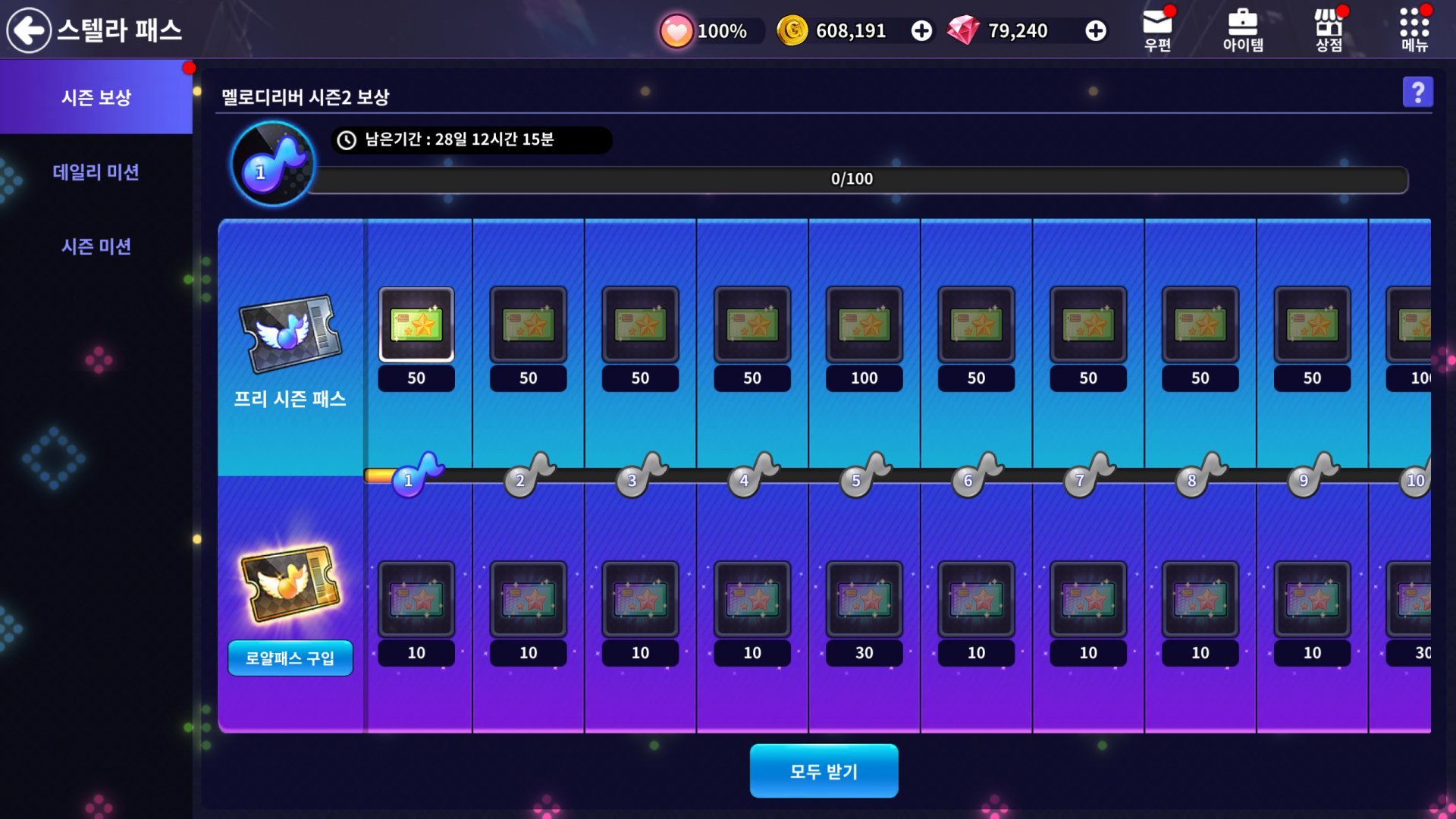 매일, 시즌 기간 동안 미션을 달성하면 패스 포인트가 쌓이고 패스 레벨이 오르게 됩니다.