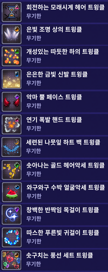 트윙클은 [드레스 룸] - [트윙클 룸]을 통해서 확인 및 장착 가능합니다.