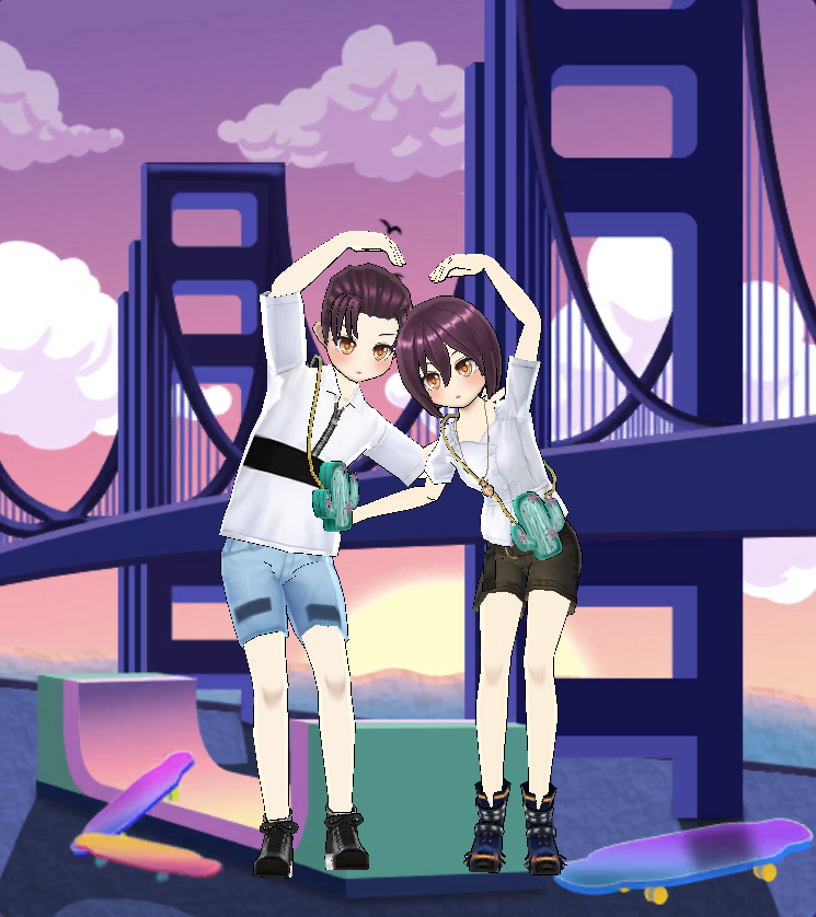 | 신규 커플 배경: 노을 지는 다리 아래 공원 |
