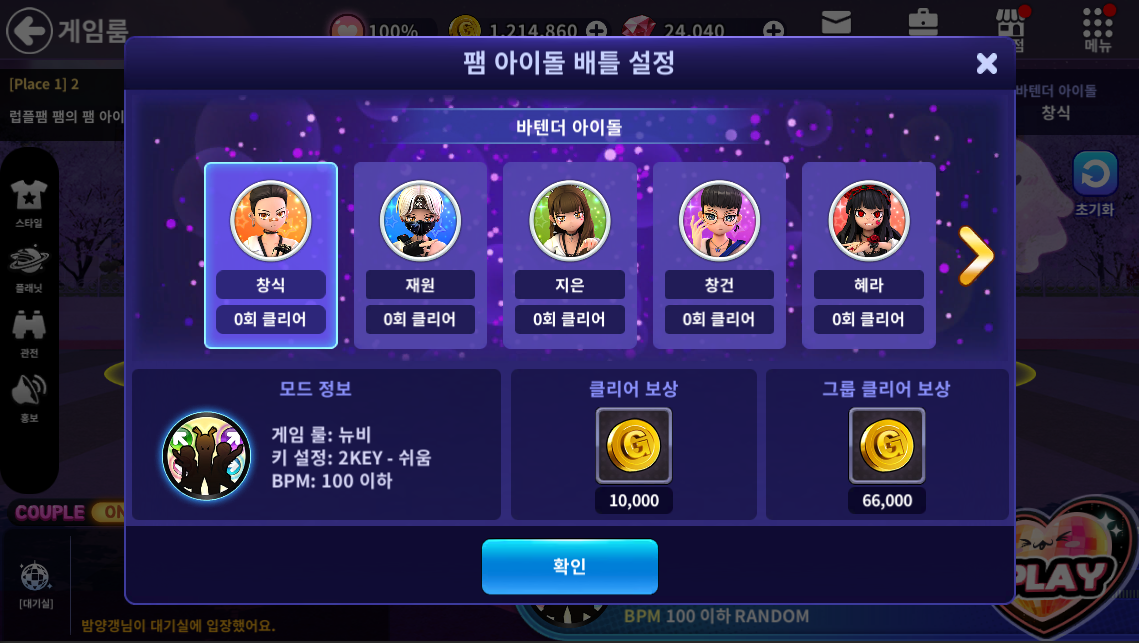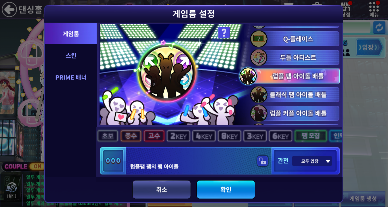 □ 팸 아이돌 배틀은 [메인 화면] - [댄싱홀] - [게임룸 생성] - [럽플 팸 아이돌 배틀]을 선택해 입장 가능합니다.