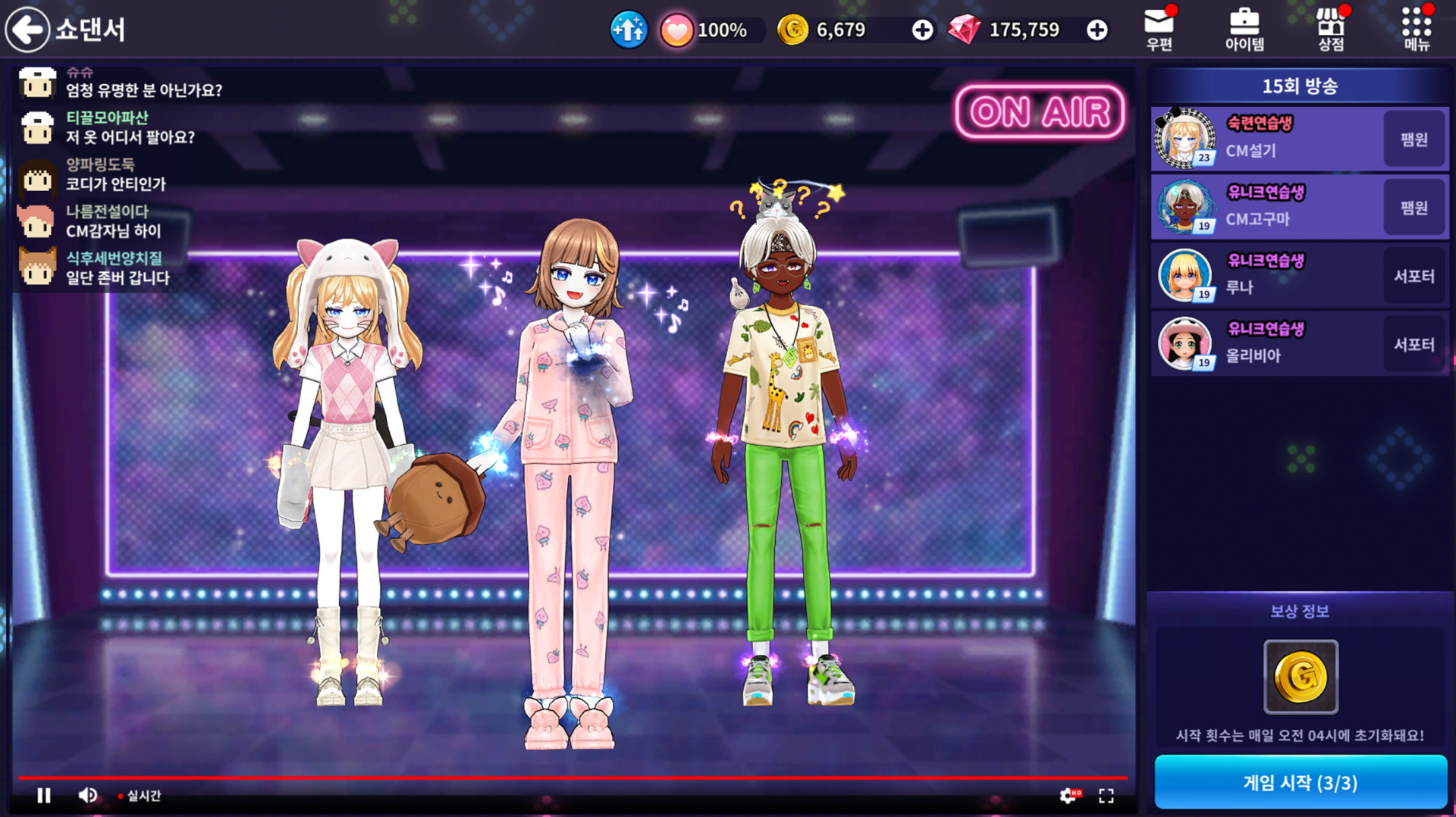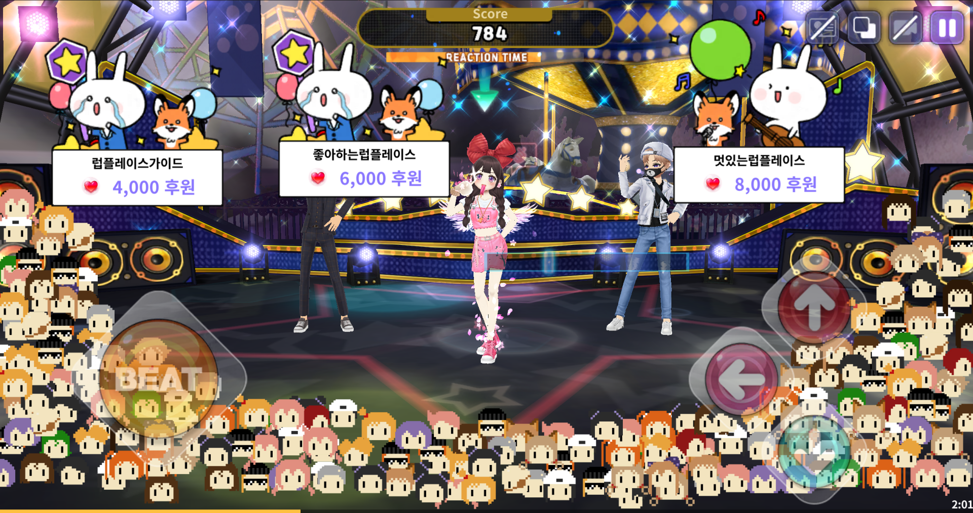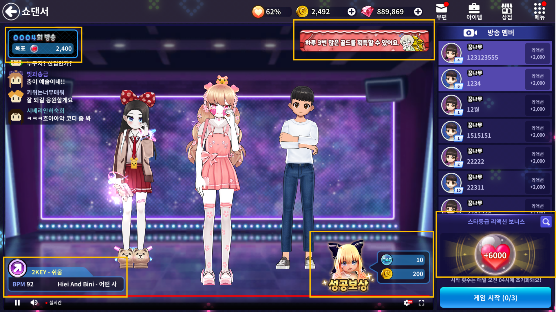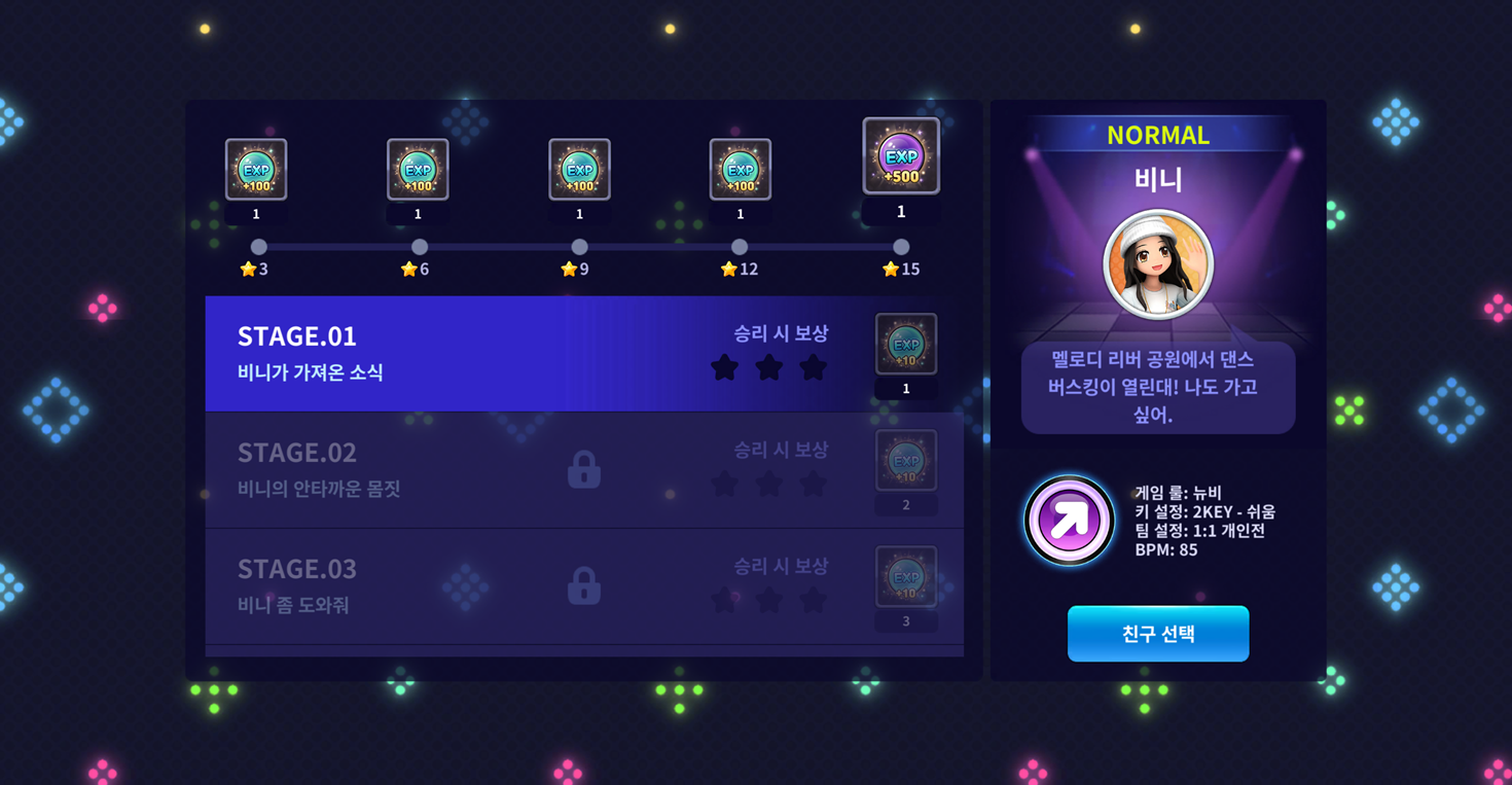 쇼댄서 시작 화면 내 목표 점수, 음원, 스테이지의 보상 정보가 추가 되었습니다.