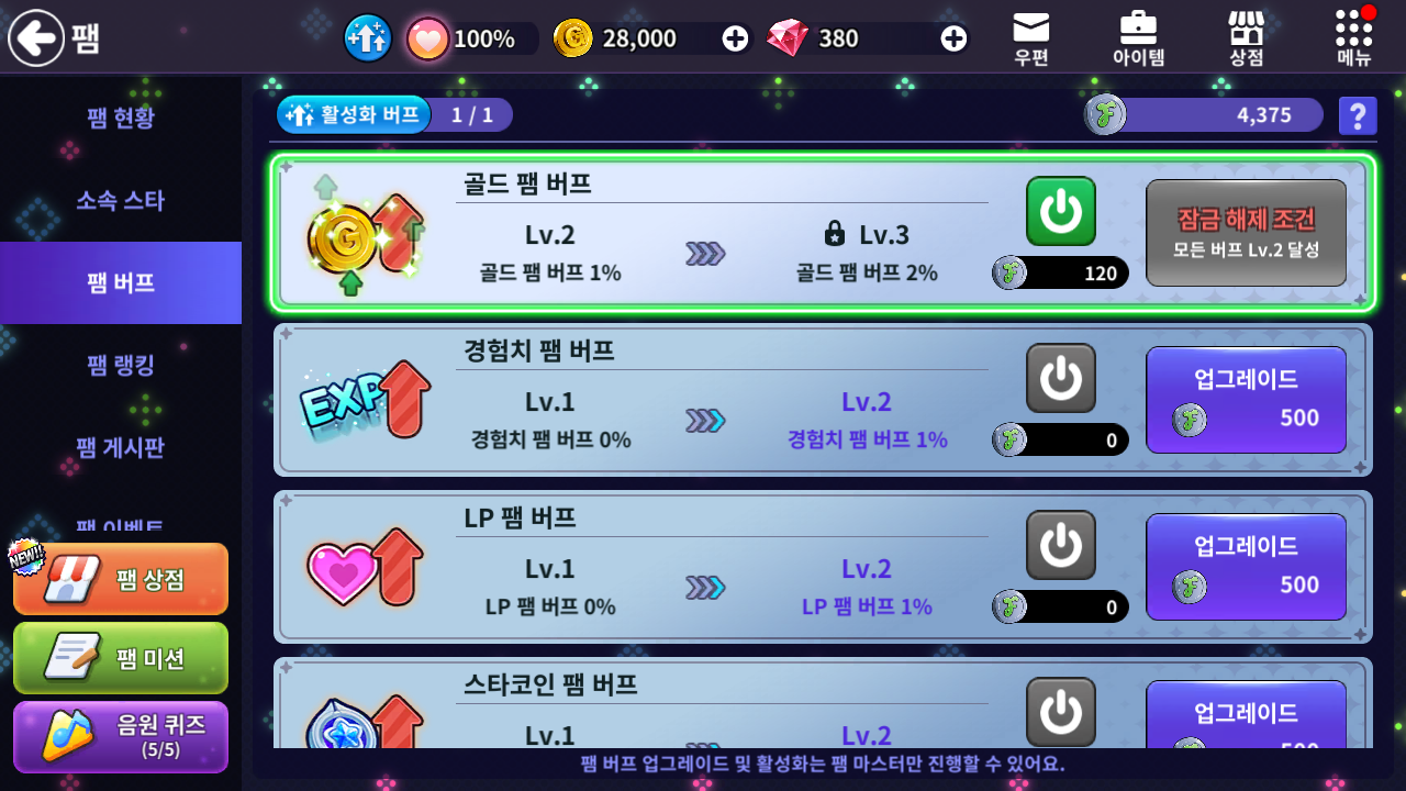 팸 버프 업그레이드 및 활성화는 팸 마스터만 진행할 수 있습니다.